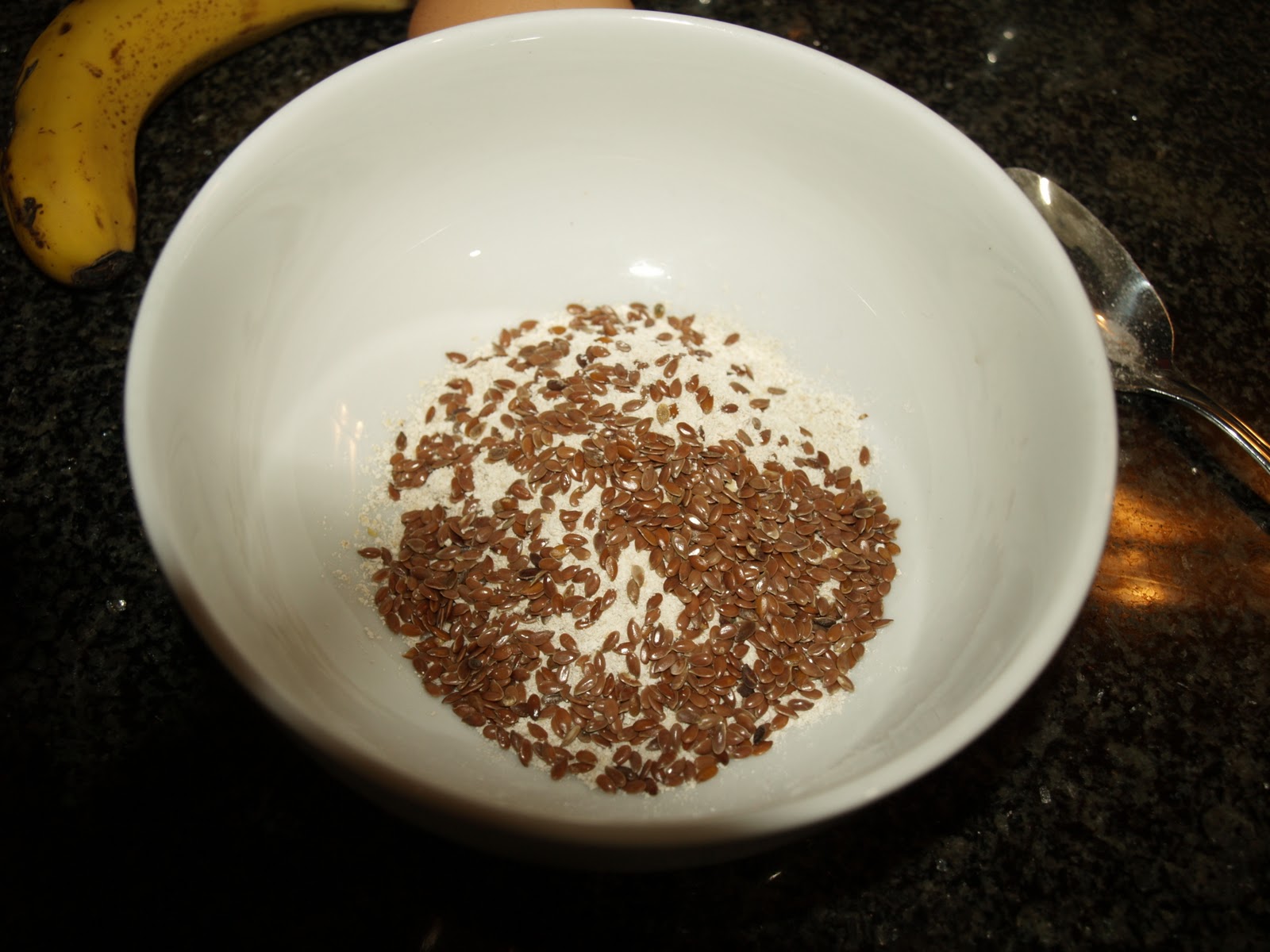 Precisamos de uma banana madura, leite magro (usei água, mas a fotografia fica mais bonita com o leite do Tiago), um ovo (usei 2 claras pasteurizadas), farinha de aveia (usei 2 colheres de sopa), sementes de linhaça (1 colher de sopa)